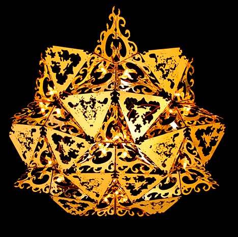 The mechanically, articulated chandelier by artist, Eddie Sykes is a cross between the 'cootie catchers' of gradeschool and modern-victorian, moving orgami, sculpture.